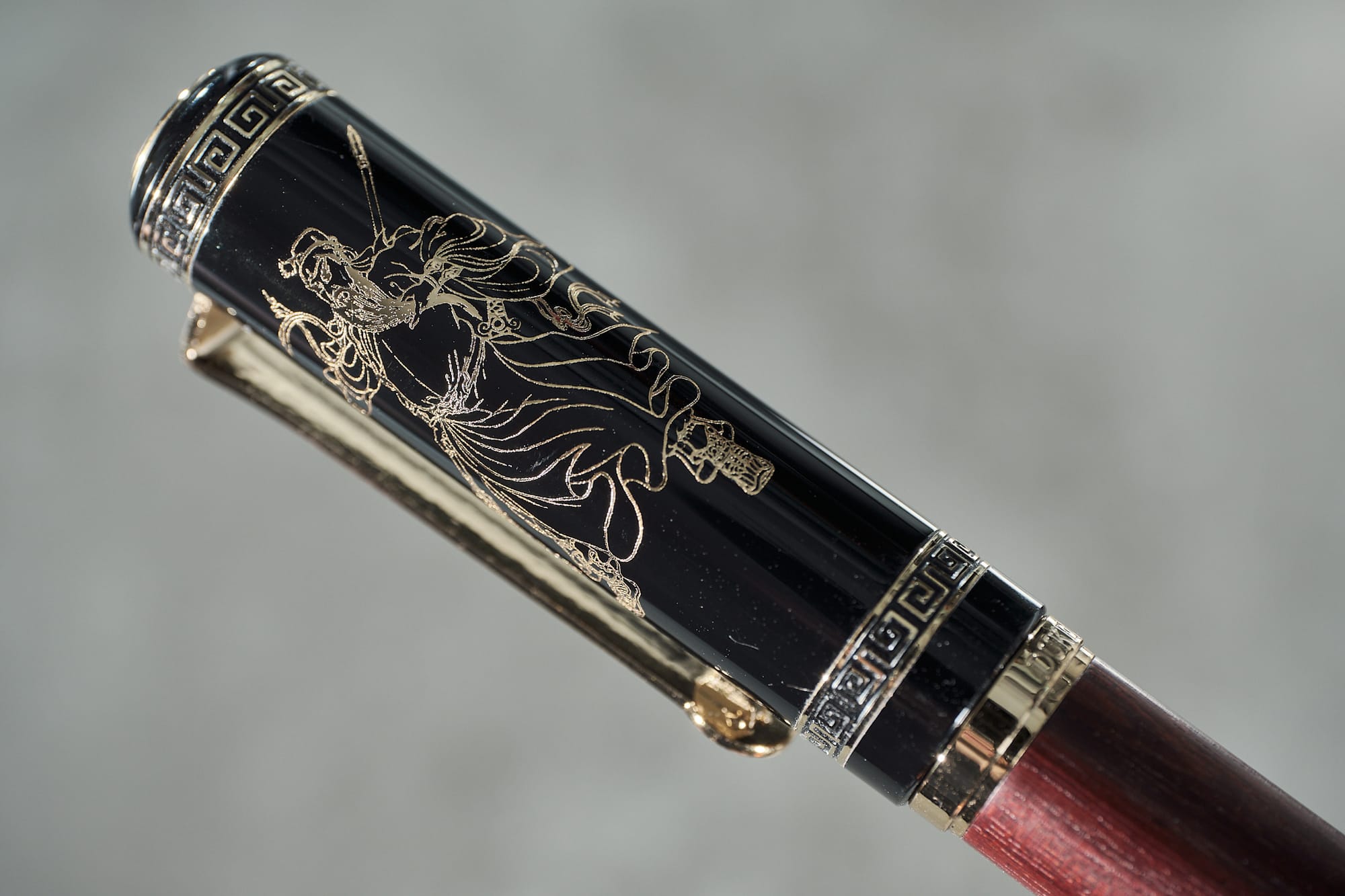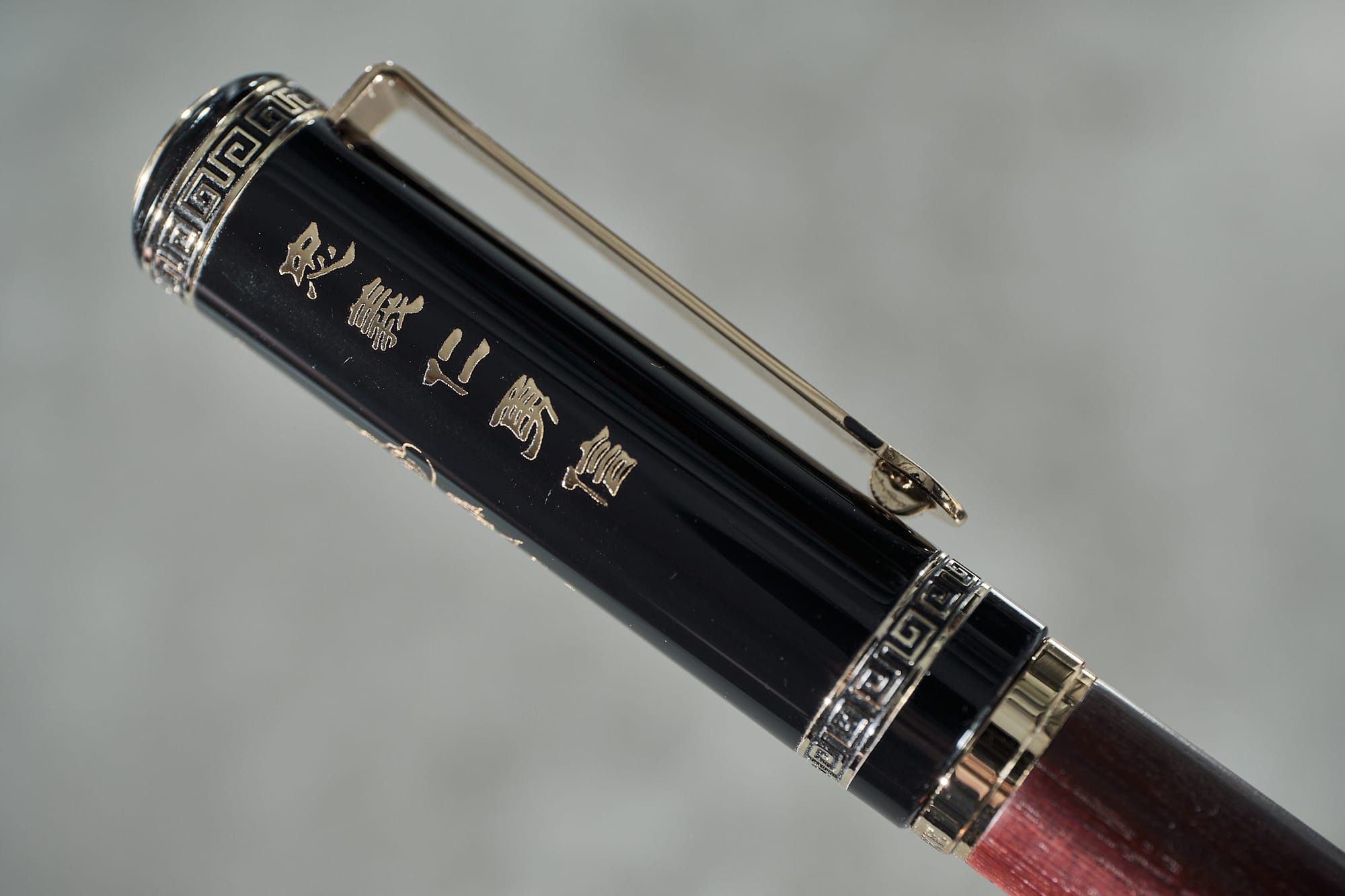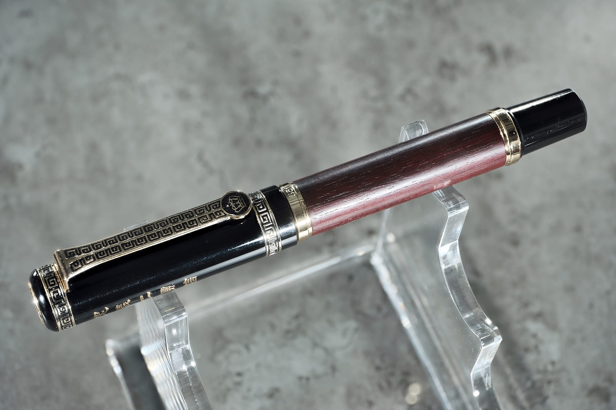 Is there anything I don't like about the pen? I'm not a fan of the barrel's plastic finial. It feels cheap compared to the rest of the pen, but I understand not wanting to add the extra weight to the back that a brass finial would bring. You may have noticed on some of these photos that the gold plating on the nib & overfeed is already flaking off, which doesn't look great. There is a version with silver trim & hardware, so this likely won't be a problem on that model. I've already mentioned I'm not a big fan of the Confucianism engravings on the cap, and the section could do with a different finish so that it's not as slippery. That's about it, though. I've enjoyed using it a lot, especially recently. It's very comfortable to hold, the wood—which is also available in Black Sandalwood, Tiger Wood, & Bamboo—feels nice, the nib is smooth & wet, and it copes very well with shimmer inks.