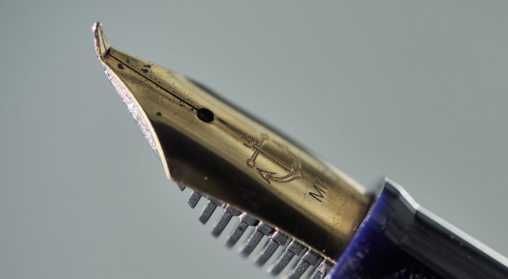 Music nibs are also a bit weird, but at least they don't look completely busted. They're similar to stub nibs, but instead of the one slit & two tines you'd see in "normal" nibs, music nibs have two silts & three tines. This makes the nib much wetter and provides an even flow of ink to the entire width of the nib. They also tend to be a bit less square than stubs. These nibs were designed, unsurprisingly, for music notation. Vintage music nibs tended to have some flex to them, but modern music nibs are mostly nails. Unlike with most pens, they're meant to be held at a high angle and perpendicular to the page instead of parallel, which gives wide horizontal lines and very thin vertical lines. I have what you could call a "non-standard" grip, so—other than the high angle—I tend to write that way anyway.